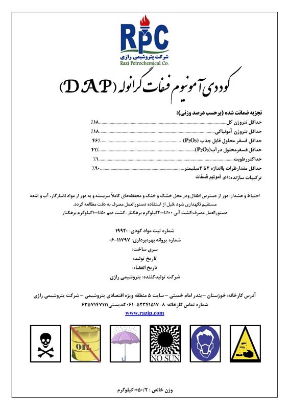 فرمولاسیون کود شیمیایی دی آمونیوم فسفات رازی حاوی ۱۸ درصد نیتروژن (ازت) و ۴۶ درصد فسفر می باشد و می تواند نیاز خاک باغات و زمین های زراعی را به این ماده برطرف سازد. آمونیوم فسفات یک واکنش قلیایی دارد و نتیجه اثر آن اسیدیته شدن خاک است. درجه بالای کود، حلالیت بالا در آب و شکل دانه این کود، مزایای اصلی این کود می باشد.